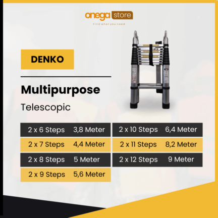 Denko Tangga Lipat Telescopic 7 Step-2 Meter / 9 Steps-2,6 Meter / 11 Steps-3,2 Meter / 13 Steps, 3,8 Meter / 14 Steps, 4,1 Meter / 15 Steps, 4,4 Meter / 15 Steps, 5,2 Meter / 16 Steps, 5,6 Meter / 16 Steps, 6,4 Meter / 18 Steps, 7 Meter